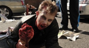 So I’ve dealt with a) actors, and b) the lack of humour, but have yet to address c) the aesthetics – the three ingredients that made Shaun of the Dead so good. Now, as I was on-set I already knew that the zombies were never going to challenge The Walking Dead for truly amazing prosthetics and make-up. But what I wasn’t expecting was such shocking continuity with these zombies. In 28 Days Later you knew what to expect: red eyes, in The Walking Dead: torn flesh and gaping, jutting jaws. But here? A mix of everything. The zombies’ eyes change from normal to red to yellow, depending on which zombie you’re seeing, and the “effects” on the zombies are extremely weak. Oddly, some have full blown sunken eyes like in The Walking Dead, but the majority look like they’ve had talcum powder sprinkled on them and that was it. As I was there, I can say that that’s not far off the truth. Sure, we all have budget constraints, but the producers should have had ALL with full-blown make-up or NONE with make-up. Not the mish-mash you see on-screen.